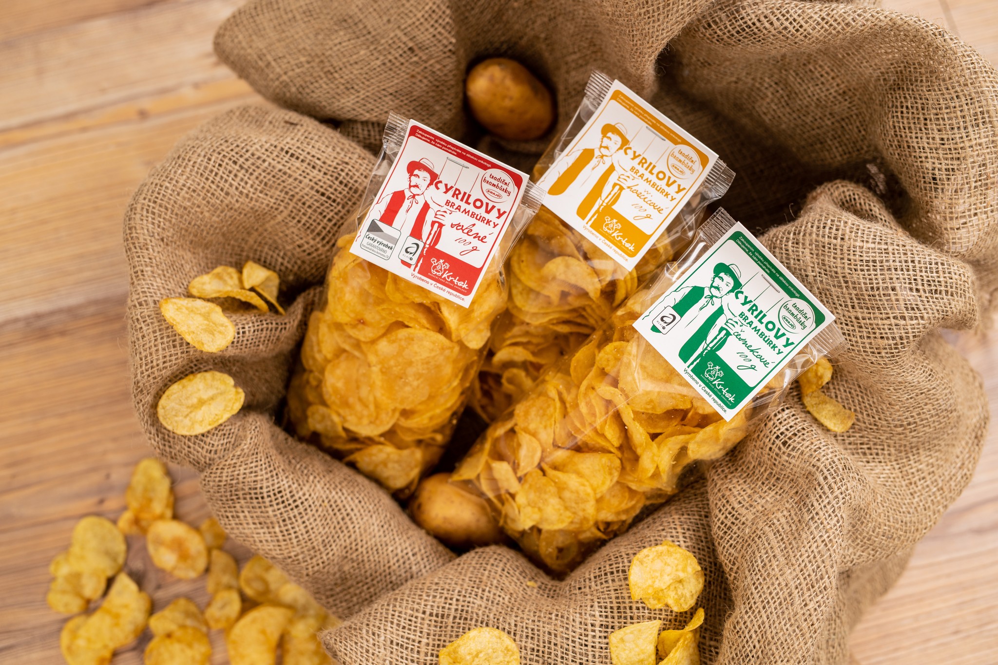 Tradiční bramborové lupínky, dozlatova smažené, křehké a křupavé. To jsou Cyrilovy brambůrky. Základními surovinami při jejich výrobě jsou pečlivě vybrané odrůdy brambor a 100% český řepkový olej, který dodává brambůrkám tu správnou chuť a barvu. Vyrábíme je s velkým podílem ruční práce, smažíme je dozlatova a dáváme pozor na to, aby byly pořád poctivé a dobré.