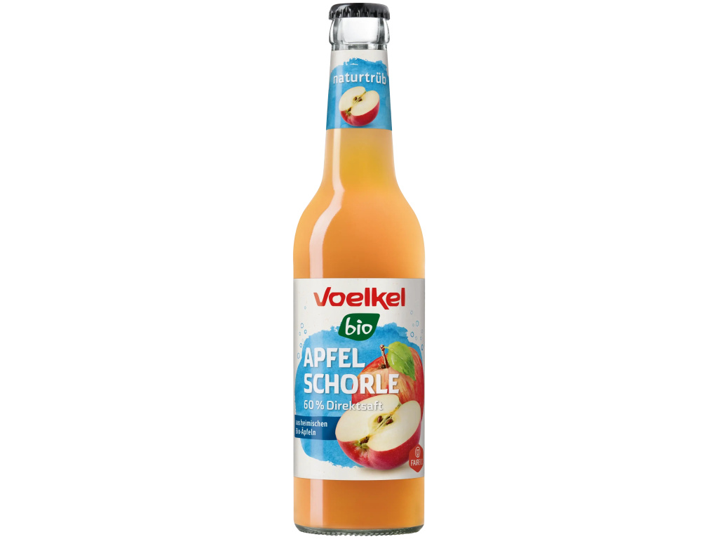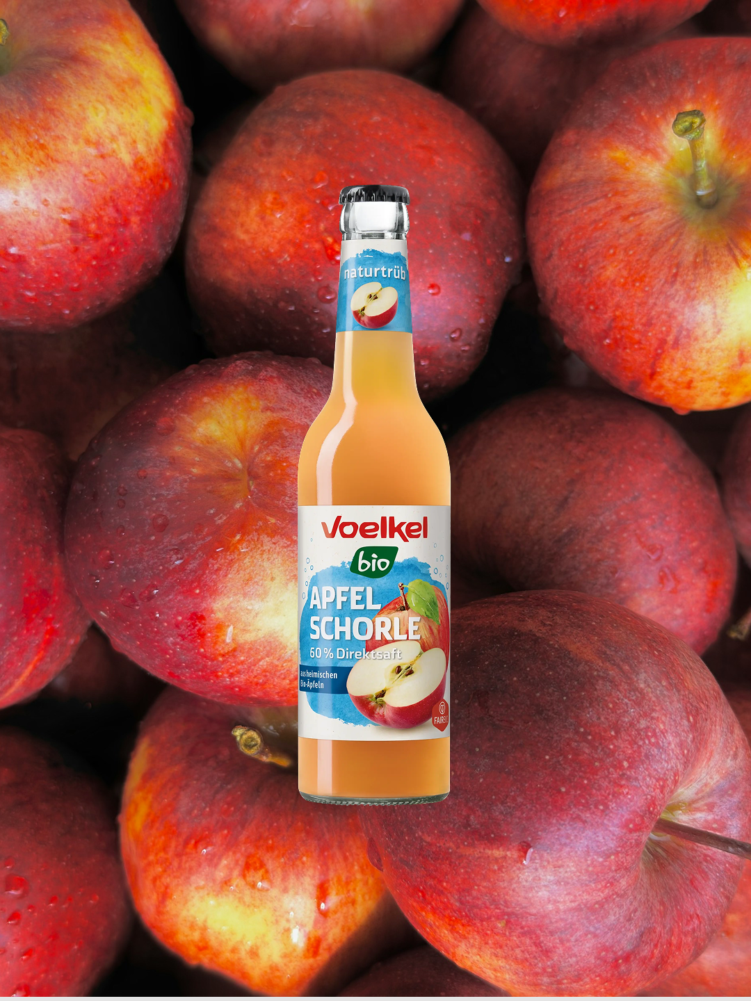 Osvěžující nápoj pro uhašení žízně pro každou příležitost: Jablečné schorle s 60 % přímo lisované šťávy z místních BIO jablek a přírodní minerální vodou z vlastního pramene.